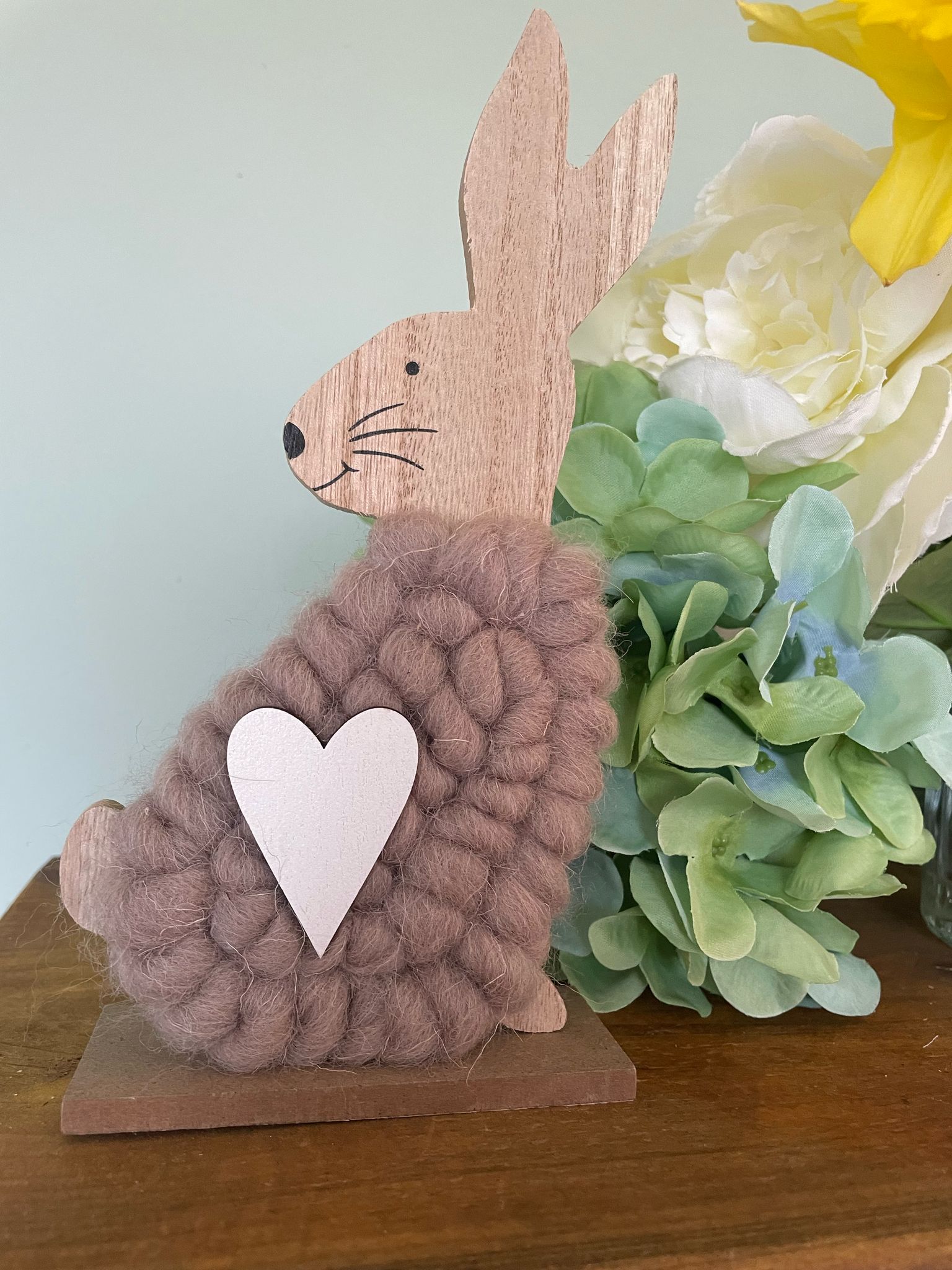 A super cute standing wood rabbit with heart decoration 15x7cm approx measurements